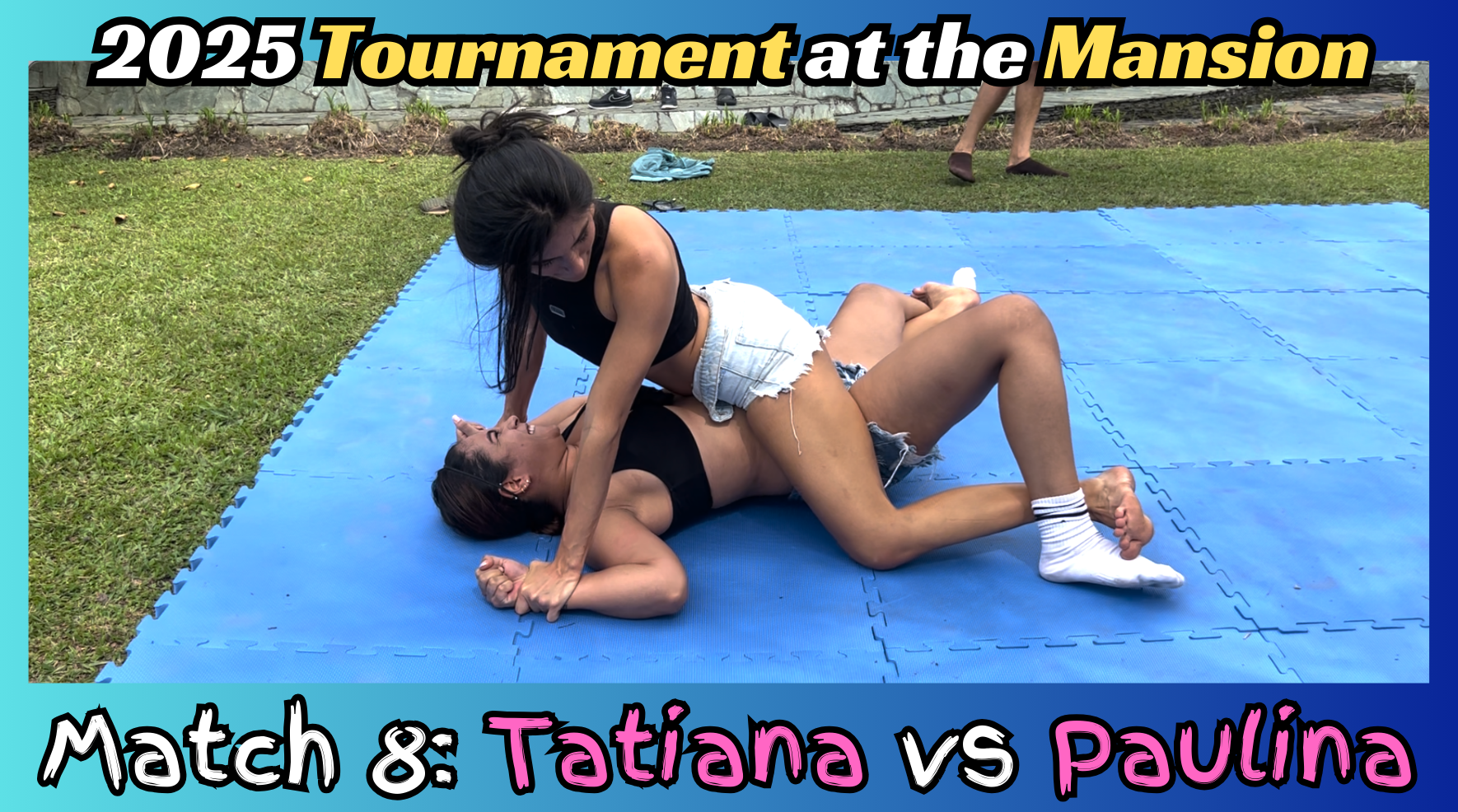 What is the 2025 Tournament at the Mansion? A Competitive Mixed Wrestling Tournament that includes 6 women and 2 men. Everyone has 3 preliminary matches that will give them a ranking from 1 to 8, followed by a single elimination playoffs. Each match has two rounds, each round is 5 minutes long. Scoring is achieved by round domination (1 or 2 points), submission (3 points), ten second schoolgirl pin (1 point), as well as end of round bonus points for body scissors or pin (1 point) or headscissors and schoolgirl pin (2 points)